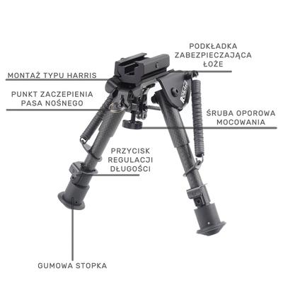 Dwójnóg regulowany od firmy Rokstad z obrotowym montażem, przeznaczony do wykorzystania na broni myśliwskiej i karabinach precyzyjnych. Jego wykonane z włókna węglowego nogi posiadają możliwość regulacji długości w zakresie 6” - 9” (155-230 mm) i zablokowania ich w jednej z 6 pozycji.
