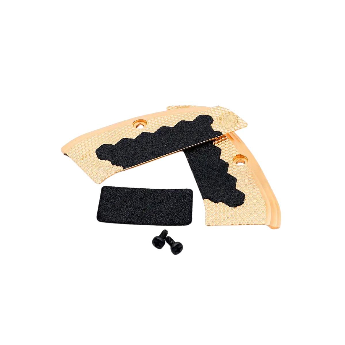 Wykonane z mosiądzu, który zwiększa wagę pistoletu i poprawia wyważenie broni podczas strzelania.