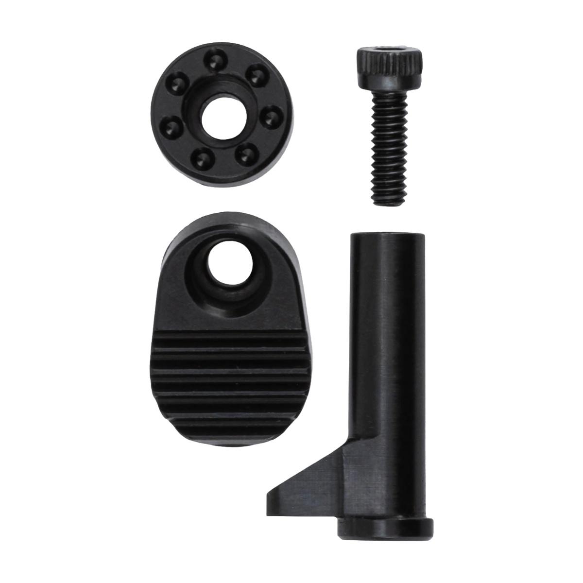Zawiera dwa przyciski, okrągły który jest wyższy i nieco szerszy od fabrycznego oraz większy w kształcie łopatki który wydłuża zwalniacz magazynka nie tylko wysokościowo ale i w kierunku strzelca.