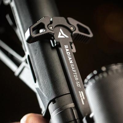 Radian Raptor SD jest obustronną dźwignią przeładowania przystosowaną do użytku z tłumikami dźwięku. Wykonana z lekkiego i wytrzymałego aluminium 7075-T6 oraz polimerowych uchwytów wzmocnionych włóknem szklanym o wysokiej wytrzymałości. Wykorzystanie połącznia aluminium i polimeru zapewnia całej konstrukcji lekkość oraz wytrzymałość. Wersja SD wyposażona jest w nacięcia rozprowadzające gazy, dzięki czemu strzelec mniej odczuwa nadmiar gazów wracających podczas strzału przy przegazowanym karabinku, np. w przypadku użycia tłumika dźwięku.
