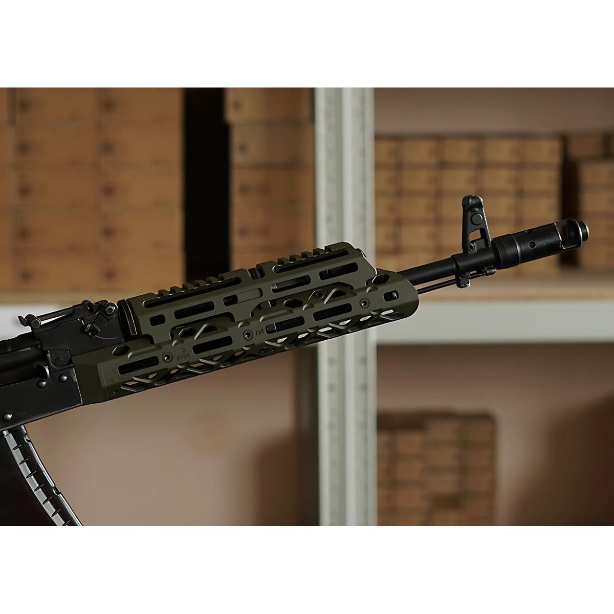 Długa osłona rury gazowej zawiera zintegrowaną szynę Picatinny i wpięcia M-LOK.