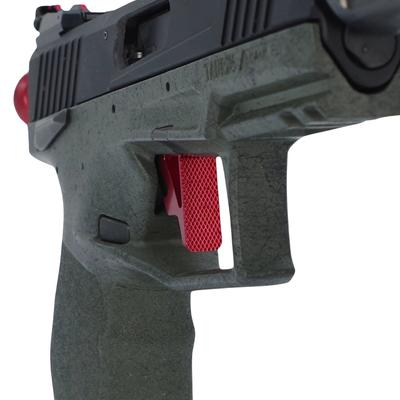Płaski spust Victory wykonano precyzyjnie z jednego kawałka aluminium. Wyposażony w śruby umożliwiające regulację długości wybrania (skoku) oraz resetu. Chropowata agresywna tekstura (o wysokiej przyczepności) zapewnia lepszą kontrolę i wyczucie a płaska powierzchnia ułatwia umiejscowienie palca niżej na spuście, zwiększając dźwignię i dając wrażenie niższej wagi (oporu) spustu.