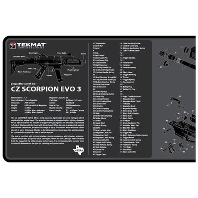 Mata została wykonana z włókien termoplastycznych oraz wytrzymałej antypoślizgowej gumy. Powierzchnia 36" jest wystarczająco duża, by pomieścić w pełni rozłożony karabin z zapasem miejsca na narzędzia i akcesoria rusznikarskie. Na jej powierzchni naniesiono grafikę przedstawiającą konstrukcję pistoletu maszynowego CZ Scorpion oraz kompletną listę części, która nie tylko dobrze wygląda, ale również pomaga podczas konserwacji.