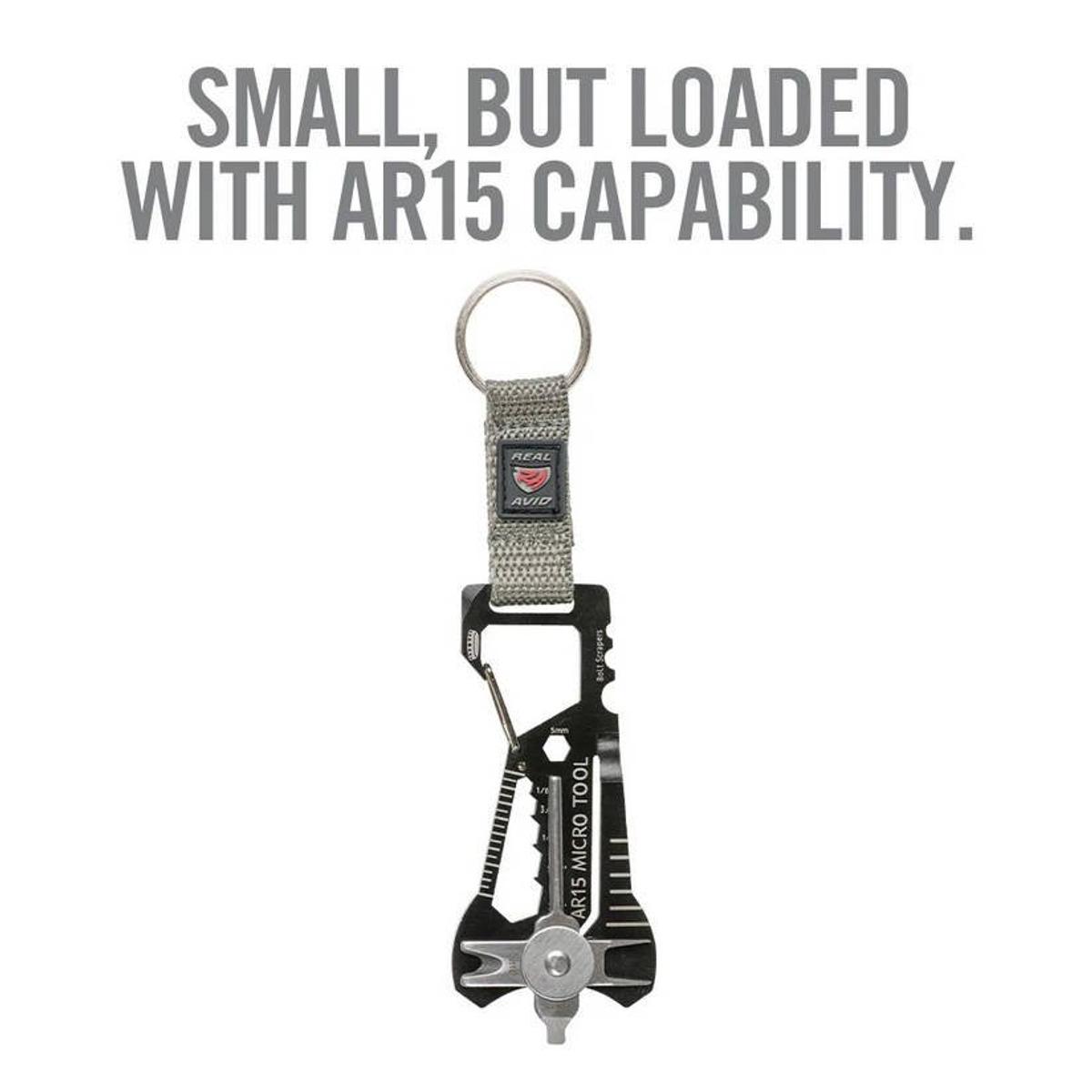 AR15 Micro Tool - kompaktowe narzędzie wielofunkcyjne w formie breloka, zawierające zestaw podstawowych i najbardziej niezbędnych narzędzi do konserwacji i obsługi broni systemu AR15.